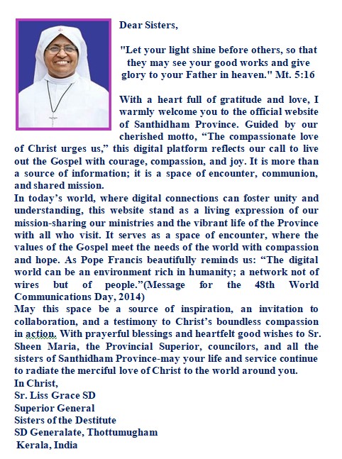 The charism of the SD in its totality has flowed into Sr.Cicily (Aleykuty) born to Mr Antony and Mrs Anna Madthiparampil of Kizhakkambalam. Driven by the inner urge of the love of God, she came forward courageously. She spent her days and nights in fasting, prayer and penance until the will of God was revealed through the authorities of the Church.SrCicily who spent a lot of time on her knees in the presence of the Blessed Sacrament drew out the honey of His merciful love thence and shared it with her younger generations by her words and deeds of love.
